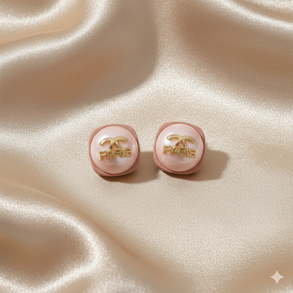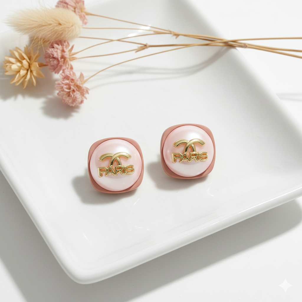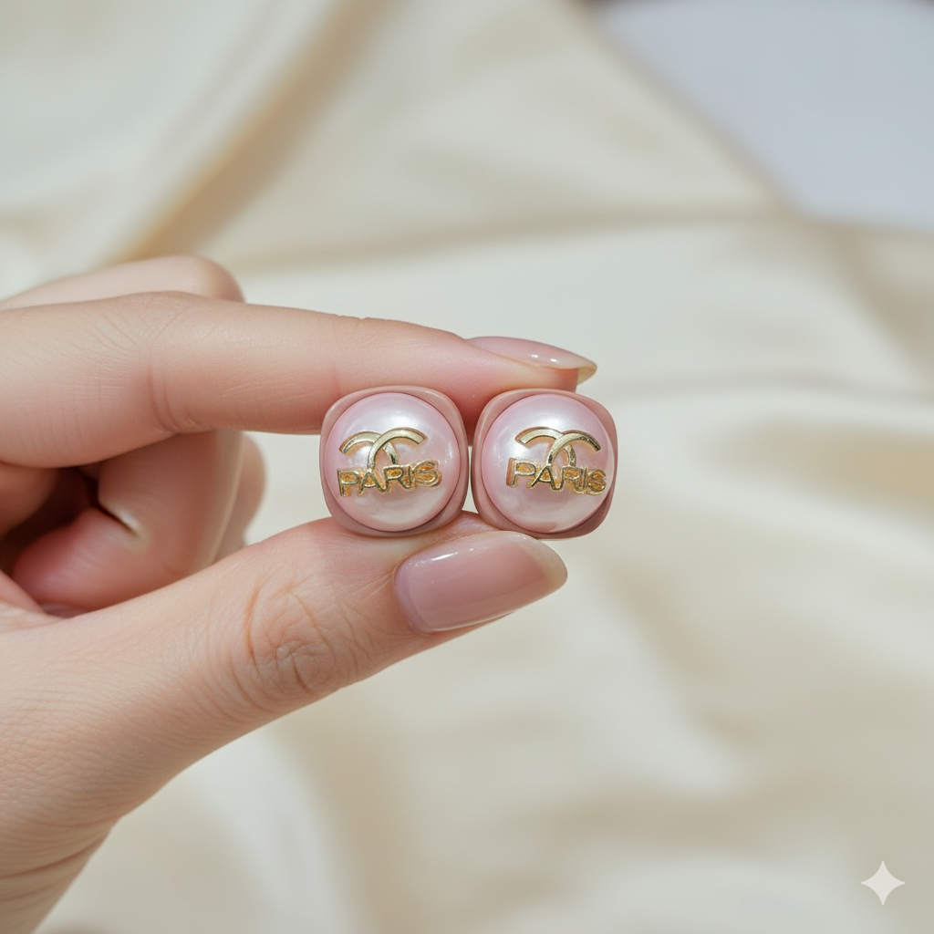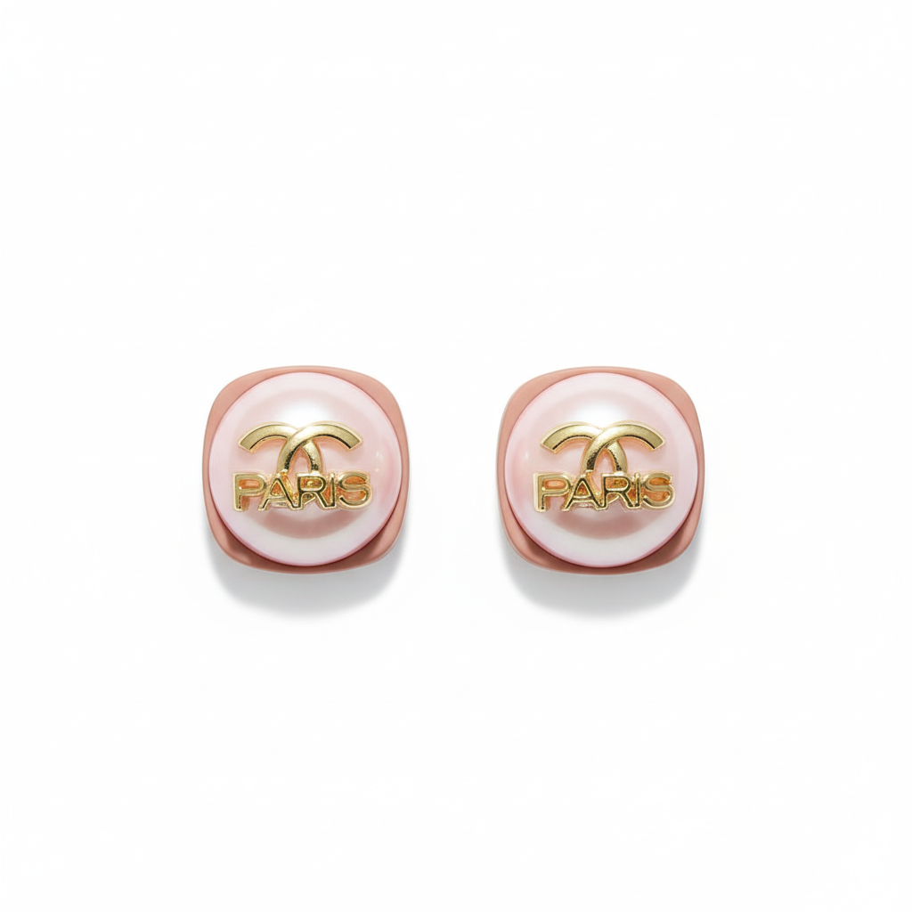 Elegant Design: Featuring a charming blend of a delicate faux pearl cabochon set within a soft pink frame, accented with a striking gold-tone "PARIS" inscription and a subtle interlocking C logo.
