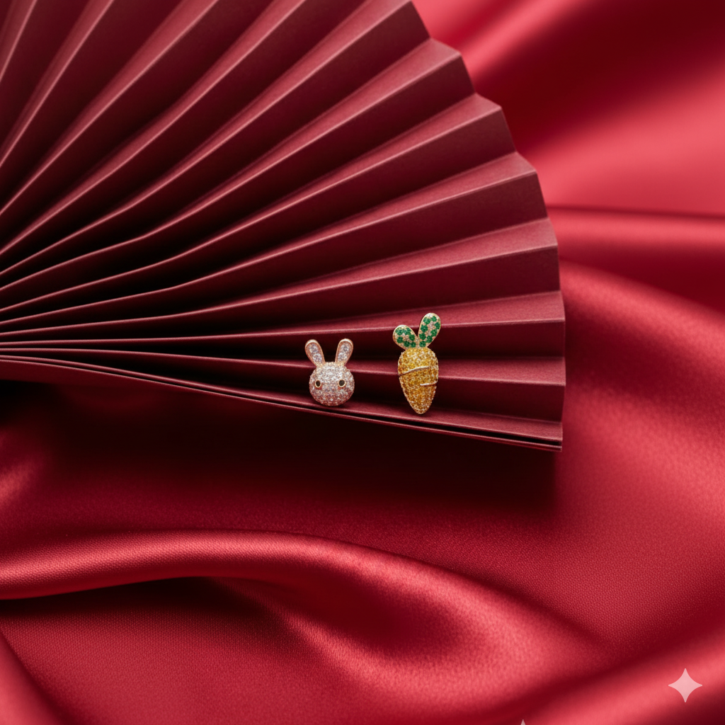 Hop into style with these adorable and unique Whimsical Carrot & Bunny Mismatched Stud Earrings! Crafted with sparkling pavé-set gemstones, these charming earrings feature one playful bunny and one vibrant carrot, creating a delightful and eye-catching asymmetry.