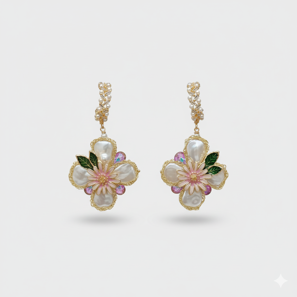 Exquisite Floral Design: Adorn yourself with these enchanting drop earrings, meticulously crafted with a delicate floral motif. Each petal is beautifully rendered in lustrous pearl-like finishes, complemented by vibrant enamel accents in soft pinks and greens, evoking the beauty of a blooming garden.