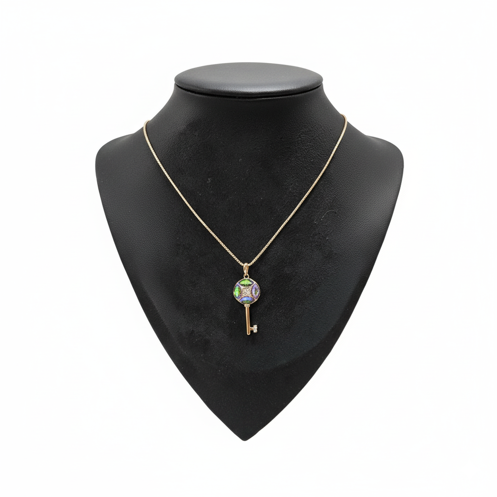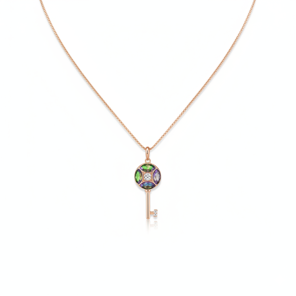 Unlock Your Style: This exquisite "Enchanted Key" pendant necklace features a unique key design, beautifully adorned with a captivating array of multicolor gemstones that shimmer with every turn. Crafted on a delicate rose gold-toned chain, this piece is a testament to sophisticated craftsmanship and timeless elegance.