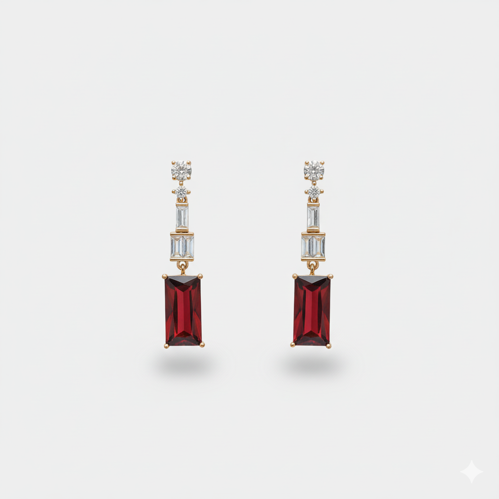 Elevate your elegance with the exquisite "Crimson Cascade" Emerald-Cut Drop Earrings. These stunning earrings feature radiant emerald-cut crimson gemstones, beautifully accented by a sophisticated sequence of brilliant baguette and round-cut clear crystals. Set in a gleaming gold-toned base, their art deco-inspired design offers a captivating blend of classic charm and modern allure.
