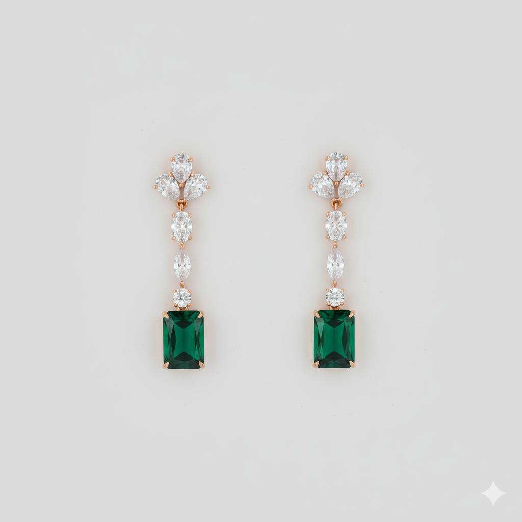 Exquisite Craftsmanship: Dazzling drop earrings featuring brilliant-cut cubic zirconia stones gracefully cascading to frame a captivating emerald-cut green crystal. Set in a radiant rose gold-tone finish for a touch of contemporary elegance.
