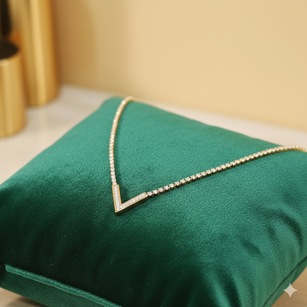 Dazzling Elegance: This exquisite necklace features a brilliant tennis chain adorned with an array of sparkling diamonds, culminating in a striking 'V' shaped pendant. Each diamond is meticulously set to maximize its fire and brilliance, ensuring you shine from every angle.