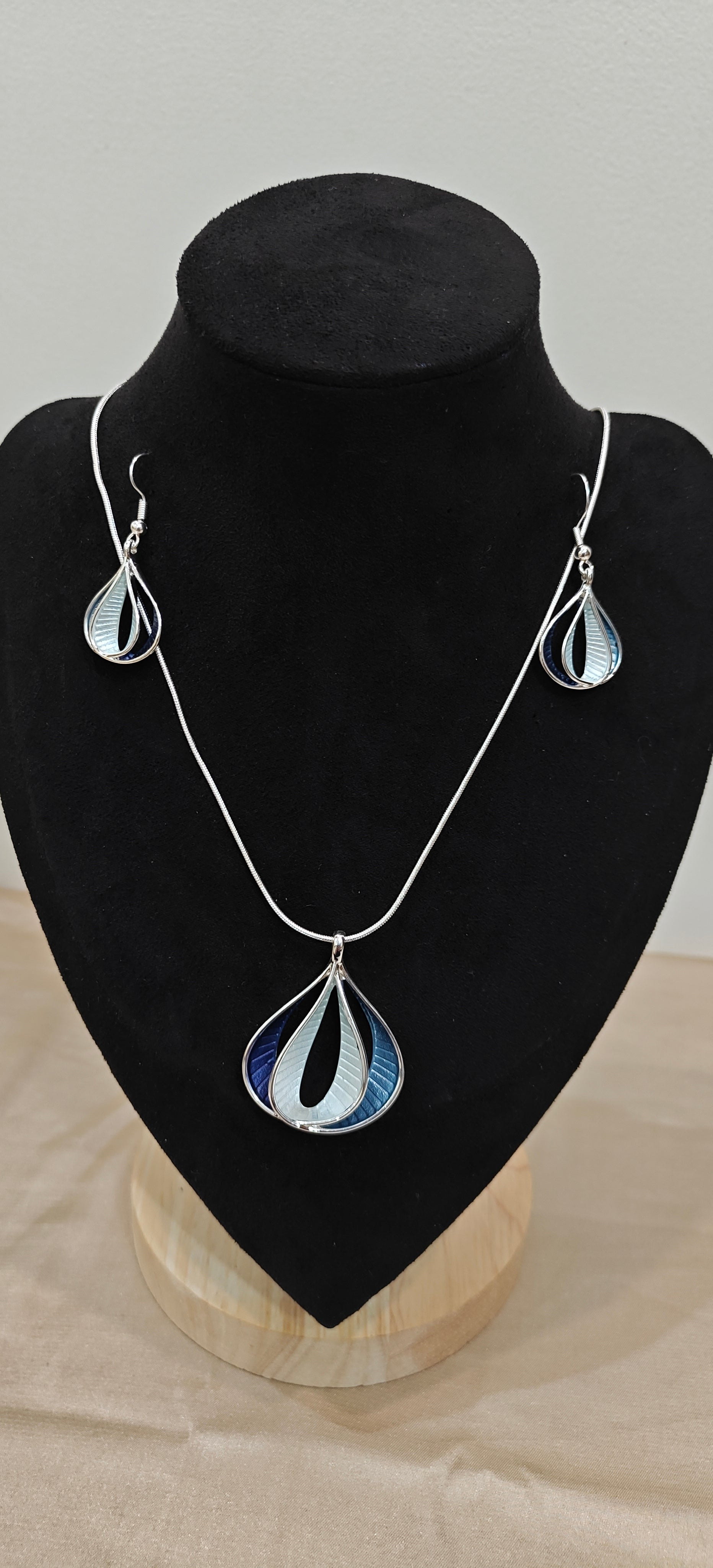 Exquisite Teardrop Design: Featuring a captivating teardrop motif with shimmering shades of blue and white, this pendant and earring set is a true statement of refined artistry.